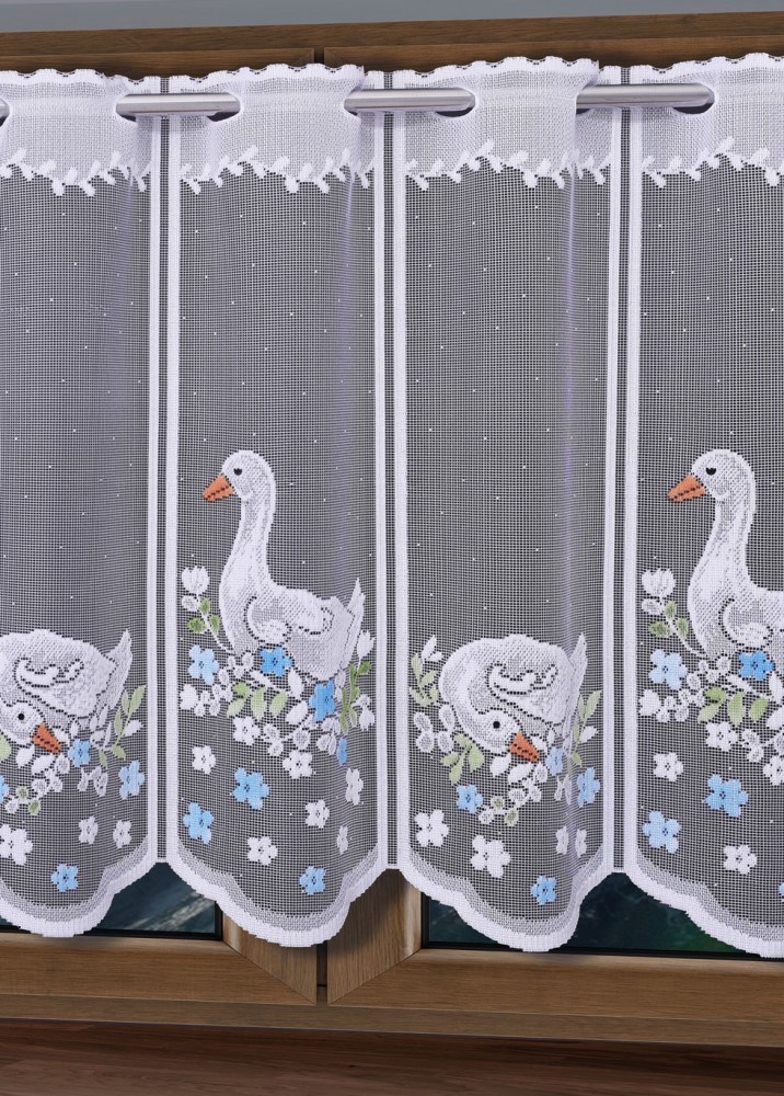 Záclonky mají na horním okraji otvory na tyčky, lze je však zavěšovat i na klasické žabky.